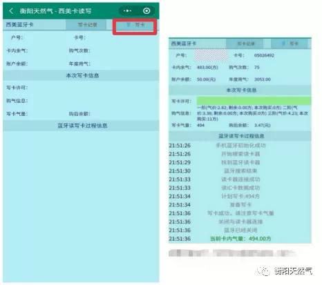 5、充值成功后將燃氣卡芯片朝下插入藍牙讀卡器中,點擊寫卡可將儲存余額轉充成氣量。(如顯示寫卡不成功,可再次點擊寫卡重試,轉氣時不能關閉藍牙。)