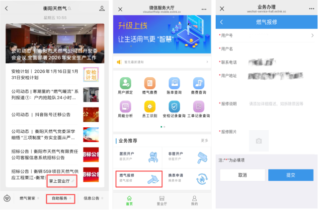 一鍵快速報修:如家中燃氣設施出現異常,可通過公眾號菜單欄進入【掌上營業廳】,選擇【燃氣報修】功能。請盡量詳細描述問題,并留下準確地址與聯系方式,維修人員將及時響應,提供上門服務。